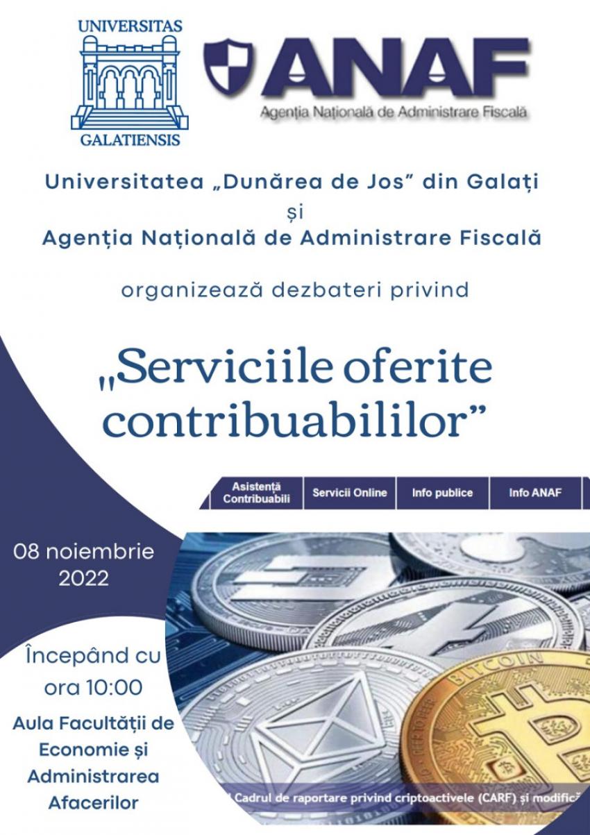 Universitatea „Dunărea de Jos” din Galaţi şi Agenţia Naţională de Administrare Fiscală organizează dezbaterea cu tema „Serviciile oferite contribuabililor”. Sunt aşteptaţi să participe studenţi şi cadre didactice de la toate facultăţile.