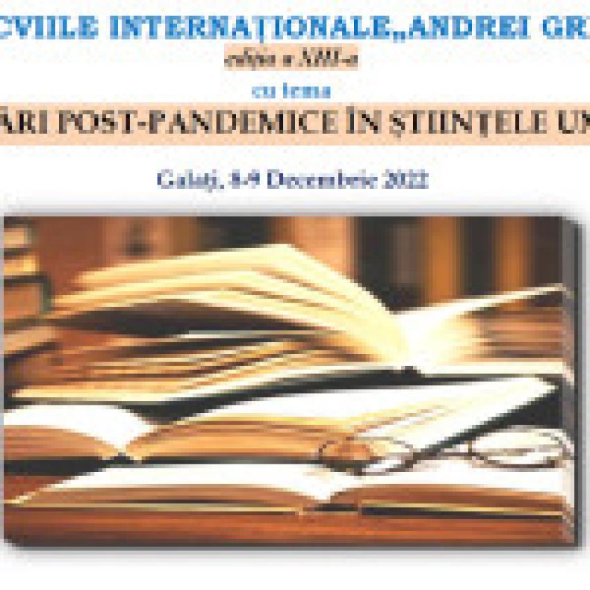 Facultatea de Litere din cadrul Universităţii „Dunărea de Jos” din Galaţi, prin Departamentul de literatură, lingvistică şi jurnalism, Centrul de Cercetare Comunicare Interculturală şi Literatură, Centrul Interdisciplinar de Studii Culturale Central şi Sud-Est Europene (ReForm - UDJG) şi Şcoala Doctorală de Ştiinţe Socio-Umane-UDJG, organizează COLOCVIILE INTERNAŢIONALE „ANDREI GRIGOR", cu tema PROVOCĂRI POST-PANDEMICE ÎN ŞTIINŢELE UMANISTE. Manifestarea, ajunsă la cea de-a 13-a ediţie, va avea loc online, în perioada 8-9 decembrie 2022.