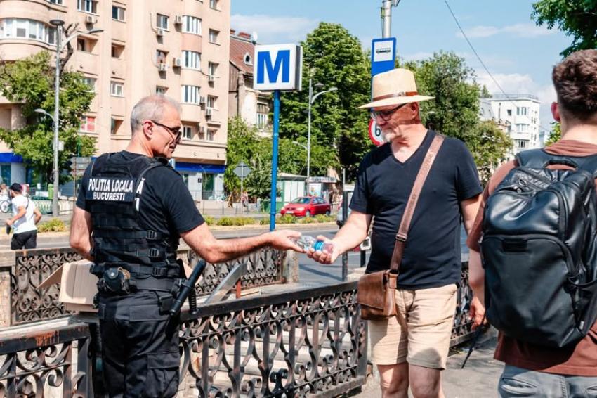 Echipele Poliției Locale București și ale Direcției Generale pentru Situații de Urgență distribuie apă potabilă gratuită în mai multe puncte intens circulate din Capitală – stații de transport public, intersecții aglomerate și zone pietonale.