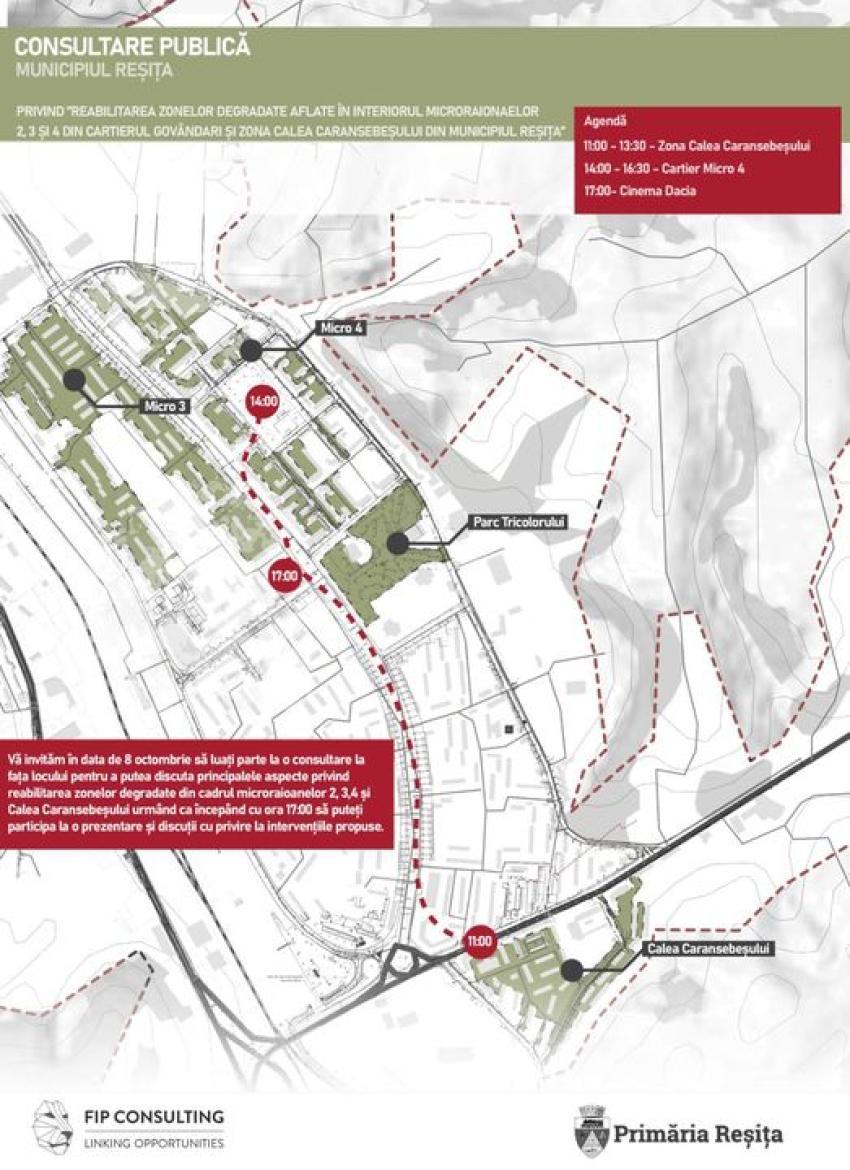 „Locuiești în Govândari și ai idei legate de investițiile necesare în cartierul tău, ai identificat o nevoie și vrei să fie rezolvată sau doar vrei să fii informat și să afli ce investiții pregătește municipalitatea la tine în zonă. Atunci participă la CONSULTAREA PUBLICĂ privind “Reabilitarea zonelor degradate aflate în interiorul microraioanelor 2, 3 și 4 din cartierul Govândari și ZONA Calea Caransebeșului. Prin acestă campanie de consultări dorim să identificăm exact problemele locuitorilor pentru a planifica următoarele proiecte de modernizare, astfel încât acestea să răspundă cât mai exact nevoilor cetățenilor”, comunicat primărie.