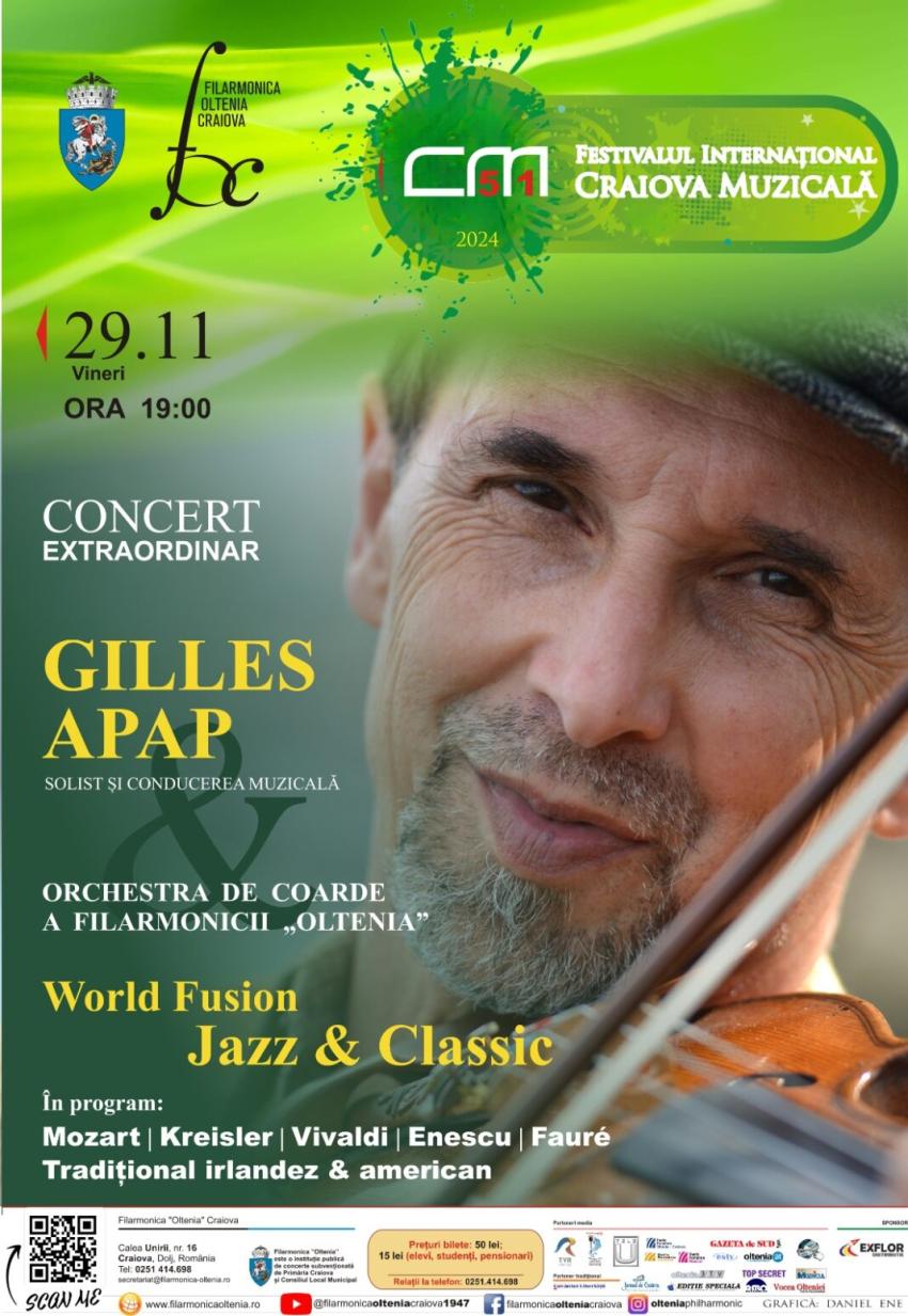 Startul acestui regal muzical este marcat de prezența extraordinară a violonistului Gilles Apap, descris de Yehudi Menuhin drept „un adevărat artist al secolului XXI”. Renumit pentru virtuozitatea sa și abordarea nonconformistă a muzicii, Gilles Apap aduce pe scena craioveană un program inedit, ce îmbină bijuterii clasice cu lucrări inspirate din folclorul irlandez, american și românesc.