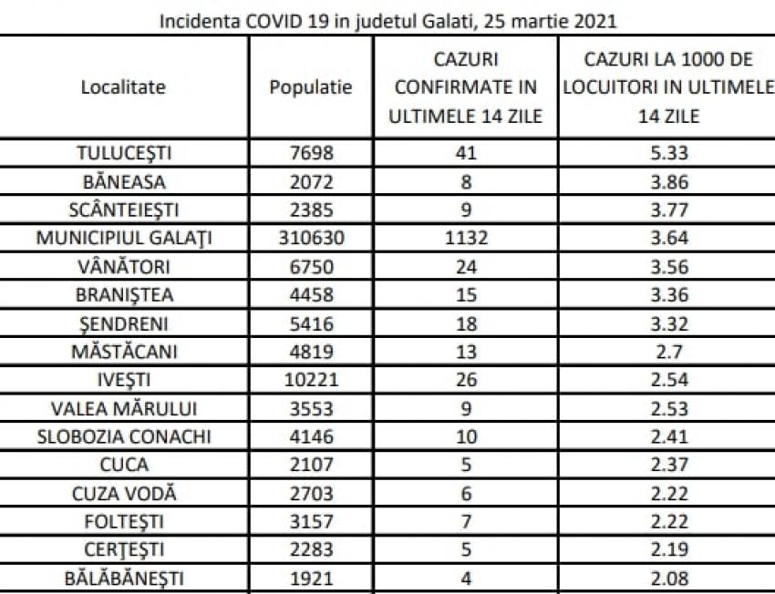 Pentru județul Galați situația se prezintă în acest moment conform tabelului – sunt trecute localitățile cu cele mai semnificative rate de infectare.