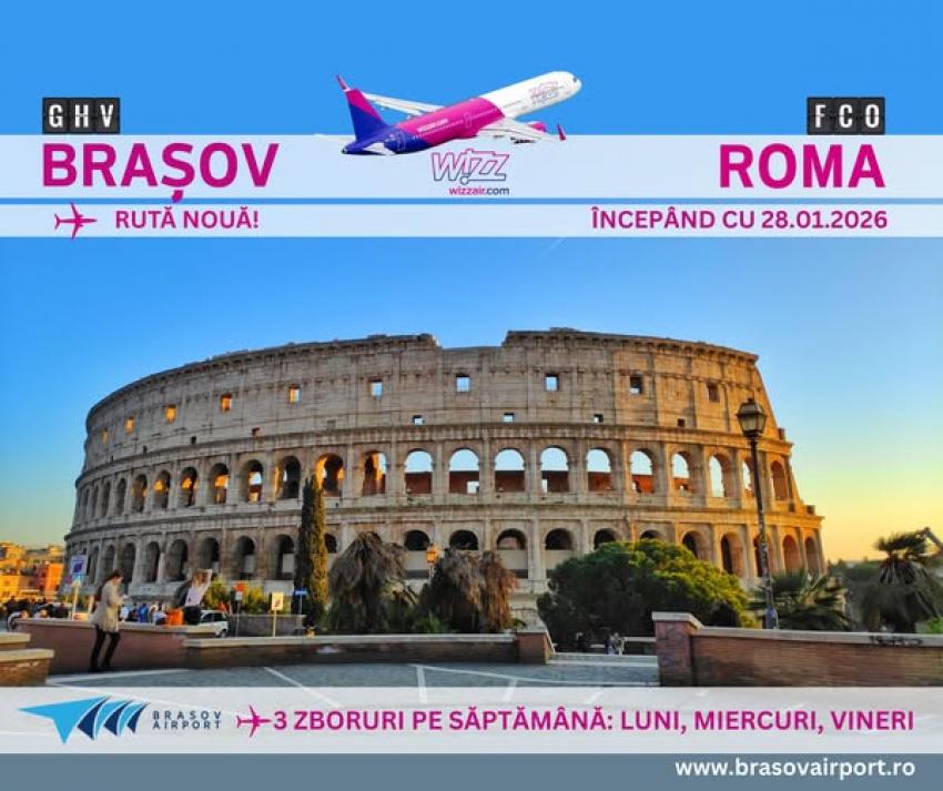 De miercuri, 28 ianuarie, Aeroportul Internațional Brașov adaugă încă o destinație, cea de-a VIII-a: Roma